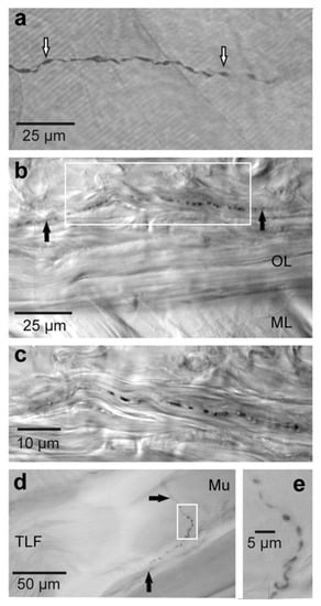 Sensory fibers and nerve endings within the rat TLF. (a) CGRP-ir fiber with numerous varicosities (open arrows). (b) SP-ir fiber with a chain of varicosities (black arrows) close to the outer layer (OL); ML: middle layer. (c) Higher magnification of the area boxed in (b). (d) SP-ir free nerve ending in a region where cells of a low back muscle (Mu) make contact with collagen fibers of the TLF. (e) Higher magnification of the area boxed in (d). Reprinted with permission from Ref. [96], Copyright 2011 Elsevier.