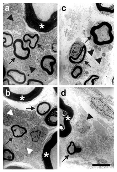 ESWT-induced loss of unmyelinated nerve fibers within the femoral nerve of rabbit hind limb. (a) Representative electron microscope images of nerve fibers within the left (a,b) and right (c,d) femoral nerve of a rabbit 6 weeks after ESWT application. A substantial reduction of unmyelinated nerve fibers is evident within the ESWT-treated right femoral nerve. Myelin sheet of large myelinated nerve fibers (asterisks); small myelinated nerve fibers (arrows); unmyelinated nerve fibers (arrowheads). Reprinted with permission from Ref. [56]. Copyright 2008 Elsevier.