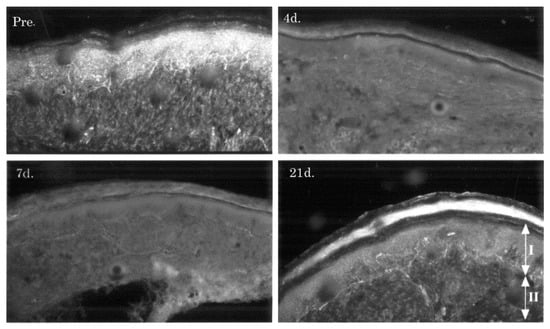 ESWT induces complete degeneration of epidermal nerve fibers in rat hind paw. A significant loss of CGRP-ir nerve fibers was evident in ESWT-treated rat skin at 4, 7, and 21 days following application compared with normal untreated skin. Reprinted with permission from Ref. [51]. Copyright 2001 Elsevier.