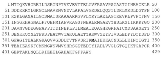 Consensus sequence of the T. cruzi enolase with a length of 429 amino acids. The constant mutation (T330M) at the 330 position of the amino acid sequence was present in eight of the 15 enolase sequences analyzed with respect to the reference enolase CL Brener strain (this mutation is represented in bold).