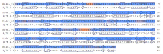 Linear alignment between the enolase consensus sequence (Model_02) and 4G7F crystallized enolase sequence using the QMEAN color scheme (orange for low and blue for ideal scoring regions).