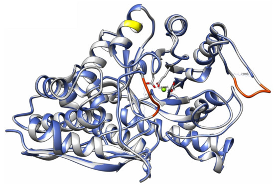 Superposition of both protein structures: modeling enolase consensus sequence (grey) and 4G7F crystallized enolase (blue). The yellow and orange regions show the methionine substitution at the 330 position and the missing regions in the 4G7F structure, respectively. Visualization of the structures was performed with the UCSF Chimera program [34].