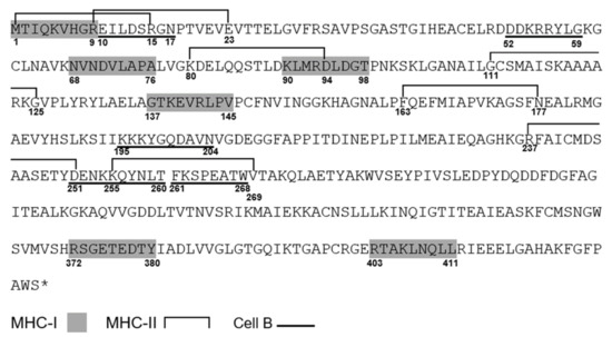 The modeling enolase consensus sequence of 429 amino acids with the highlighted predicted epitopes. MHC-I epitopes are shown in the grey shadow, MHC-II epitopes are shown with superior brackets, some of them overlapping, and B cell epitopes are underlined. The symbol * indicates the termination of the open reading frame.