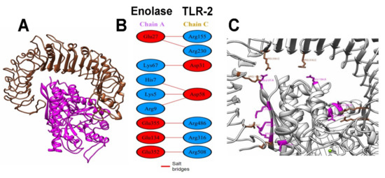 (A) Interaction between the TLR2 (brown) and enolase consensus (magenta); (B) PDBsum analysis, schemes with the type and number of interactions between the residues of the A chain (modeling enolase) with the C (TLR 2) with the same formatting; (C) contact points for salt-bridges between the TLR2 (brown) and enolase consensus (magenta).