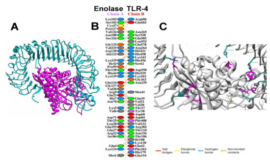 (A) Interaction between the TLR4 (cyan) and enolase consensus (magenta); (B) PDBsum analysis, schemes with the type and number of interactions between residues of the A chain (modelling enolase) with the C (TLR4) with the same formatting; (C) contact points for salt-bridges between TLR4 (cyan) and enolase consensus (magenta).