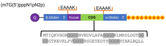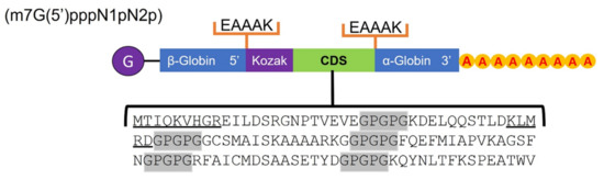 Two protein chimeras containing the predicted epitopes were manually designed, mainly for T cells, six for MHC-I, and seven for MHC-II. The connector peptides to bind these epitopes were used: GPGPG and GGGS for their high flexibility and EAAAK for their rigidity, respectively. Both chimeras were made up of a type 0 Cap (Cap) (m7G(5′)pppN1pN2p), an untranslated region (UTR) sequence with the coding gene for β-globin in the 5′ region; an EAAAK linker coding sequence; a Kozak sequence immediately followed by the cytotoxic T lymphocyte (CTL) and helper T lymphocyte (HTL) epitope coding sequence separated by the GGGS and GPGPG linkers, respectively; an EAAAK linker coding sequence attached to a UTR with the gene for α-globin in the 3′ region; and finally a poly-A tail of 120–150 bases.