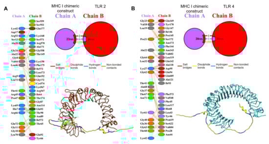 For the interaction of the MHC-I protein chimeric construct with the TLR4 receptor, the analysis showed the presence of one salt-bridge, one hydrogen-bridge, and 155 weak bonds as well as 20 residues of the A chain (MHC-I construct) interacting with 30 residues of the B chain (TLR4, in an area of 1267 and 1034 Å2 for the A and B chain (Figure 10B).