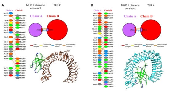 For the interaction of the MHC-II protein chimeric construct with the TLR4 receptor, the analysis showed that this interaction was confirmed by the presence of four hydrogen bridges and 197 weak bonds as well as 29 residues of the A chain (MHC-II construct) interacting with 31 residues of the B chain (TLR4, in an area of 1555 and 1492 Å2 for the A and B chains (Figure 11B).