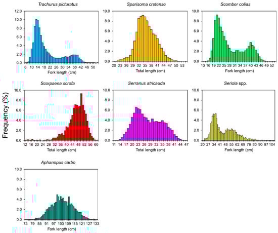 Since harvesting of the studied species is not sex-based, stock assessment models should need a single set of population parameters. Nonetheless, the disparities in development between the sexes may require a change in management regulations to limit effort, especially on the target component, which is particularly vulnerable to overexploitation. Future research should therefore investigate these particularities since the dataset used in this study did not allow progress in this way. This is even more important when it involves sequential hermaphroditic species with sexual dimorphism, such as S. cretense [27]. Additionally, captures of resources such as T. picturatus, S. cretense, S. colias, S. atricauda and Seriola spp. are not completely landed since they are also fished for self-consumption or utilized as live bait in tuna fisheries [10,32]. Therefore, samples from the commercial landings may be under-represented, and special attention will need to be given to the sampling design to ensure that representative samples are taken. In addition to that, stock units for all the studied stocks are not clearly defined [10]. As a result, it is impossible to know whether the stocks were fully sampled across their entire range of distribution and dynamic aspects of the population or whether the samples analyzed referred only to a fraction of the population.