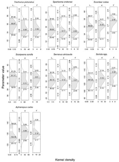 Estimates of asymptotic length (L∞; cm), growth rate coefficient (k; year−1), and growth performance index (ϕ’) with 0.95 confidence intervals for blue jack mackerel Trachurus picturatus, parrotfish Sparisoma cretense, Atlantic chub mackerel Scomber colias, red scorpionfish Scorpaena scrofa, blacktail comber Serranus atricauda, amberjacks nei Seriola spp. and black scabbardfish Aphanopus carbo in the Azores between 1990 and 2017 (species-specific sampling periods are shown in Table 2). y-axis—growth parameter value; x-axis—kernel density estimate; horizontal lines—location of the mode (maximum density peak) and the lower and upper 95% quantiles of the univariate kernel density distributions.