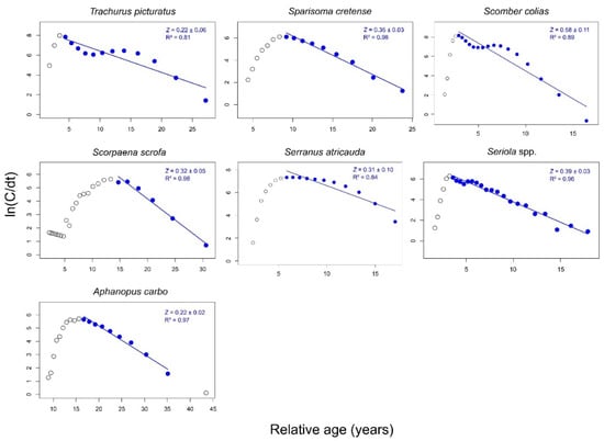 Natural mortality (M) and fishing mortality (F) can denote the indication of an overfishing status [5]. The optimal scenario for a population is when fishing mortality equals natural mortality, which means that fishing operations exploit the portion of the population that would otherwise be lost due to natural mortality [73]. With knowledge of these parameters, one can manage the stocks and establish the optimal exploitation rate (i.e., E = F/(F + M) = 0.5) that maximizes catch while maintaining the reproductive proportion of the population [73]. Values of M and F were estimated as 0.15 and 0.07 year−1 (E = 0.3) for T. picturatus, 0.20 and 0.15 year−1 (E = 0.4) for S. cretense, 0.30 and 0.28 year−1 (E = 0.5) for S. colias, 0.20 and 0.12 year−1 (E = 0.4) for S. scrofa, 0.21 and 0.10 year−1 (E = 0.3) for S. atricauda, 0.21 and 0.18 year−1 (E = 0.5) for Seriola spp., and 0.16 and 0.06 year−1 (E = 0.3) for A. carbo. These values suggest that S. cretense, S. colias and Seriola spp. have optimum exploitation rate (M ≈ F), but T. picturatus, S. scrofa, S. atricauda and A. carbo are underexploited (M > F).
