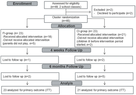 The participants were randomly grouped into a family-intervention group (FI) (n = 23) and a control group with only child-intervention (CI) (n = 23) using Randlist, DatInf GmbH, Tübingen, Germany, before the commencement of the study. Owing to the nature of the intervention, participants and outcome assessors could not be blinded to treatment assignments. Two children of the CI-group became ill before the intervention started, so the final group size was n = 21. The study period was 2 weeks and follow-ups were conducted 4 weeks and 6 months after study termination. The inclusion criterion was an age between 9 and 12 years (all children who were in the 4th grade of primary school). Major linguistic difficulties in children or parents were an exclusion criterion. Due to ethical reasons, exclusion was conducted after study participation.