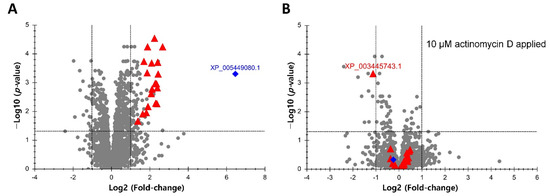 Increases in protein abundances of Mozambique tilapia OmB cells exposed for 24 h to hyperosmolality (650 mOsmol/kg) compared to isosmotic controls (315 mOsmol/kg) were calculated based on DIA data using Skyline and MSstats and visualized using volcano plots. Remarkably, the upregulation of all statistically significant proteins (multiple testing correct p < 0.05 and fold-change > 2) was abolished when transcription was inhibited by the inclusion of 10 µM actinomycin D in the medium (Figure 1). This result confirms transcriptional regulation as a predominant mechanism underlying the upregulation of proteins during hyperosmotic stress. Nineteen hyperosmotically upregulated proteins whose upregulation was completely abolished by transcription inhibition were chosen to serve as a basis for identifying common motifs in their regulatory sequences. These proteins are indicated as red triangles in Figure 1. Inositol monophosphatase (XP_005449080.1) was not included in this set even though it showed the same pattern of regulation (blue diamond in Figure 1) because the extent of upregulation was more than an order of magnitude greater than for the other proteins and we had previously analyzed the regulation of this protein and its corresponding gene in depth [17]. Interestingly, one of the 19 proteins selected for motif searching (ferritin, heavy subunit, XP_003445743.1) was significantly downregulated in the presence of actinomycin D, suggesting that it may be subject to very rapid turnover in OmB cells exposed to hyperosmolality.