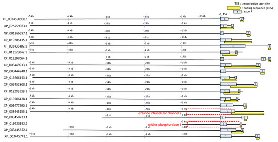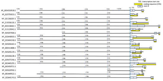 Regulatory sequences (extended promoter up to intron 1) of the 19 genes that showed transcriptional upregulation of corresponding proteins during hyperosmotic stress were obtained by searching the NCBI genome database for O. niloticus. Geneious prime 2022.0.1 (Biomatters) was used to extract and visualize approximately 5 kb of each of these 19 regulatory sequences (Figure 2). The criteria by which the regulatory sequences of each gene were selected from the downloaded NCBI sequence database were as follows: 1. Trim up to 5 kb long upstream regulatory region relative to transcription start site (TSS); 2. If the upstream regulatory region is overlapped with another gene body nearby, trim up to that point of the overlap; 3. The 5’ untranslated regions (UTRs) were included (such as exon 1 and intron 1). The last criterion we adopted in this study was to rationalize according to our previous publications elucidating where CREs (in particular, osmotically responsive CREs) are located. We previously identified seven osmotically responsive CREs (OSRE1) that were localized between −232 and +56 relative to the TSS and intron 1 in several osmotically regulated genes [17,18]. Thus, emphasis was placed on including this region for each of the 19 genes.