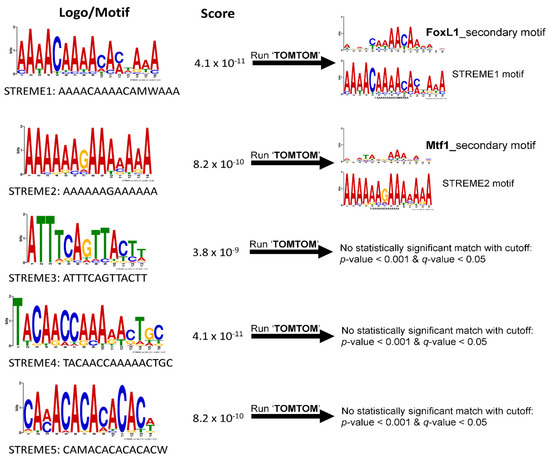 STREME analysis was performed on the 19 regulatory sequences to find putative hyperosmolality-responsive motifs that are enriched in the set of the regulatory sequences (Figure 3). STREME analysis yielded five motifs. For each of the resulting STREME motifs (STREME1 to STREME5), detailed information (e.g., logo, motif sequence, score) is shown in Figure 3. These five discovered motifs were then subjected to TOMTOM motif comparison analysis to see if any motif discovered by STREME resembles a previously known TF binding site (Figure 3). TOMTOM compares motifs against publicly known TF binding motif databases (e.g., JASPAR) and ranks the motifs in the database to produce an alignment for each significant match. This analysis revealed that STREME1 and STREME2 best match to the Forkhead box protein L1 secondary motif (FoxL1_2nd) and metal response element binding transcription factor 1 secondary motif (Mtf1_2nd), respectively. The other three motifs (STREME3, STREME4, and STREME5), however, yielded no statistically significant match with the cutoff values of p-value < 0.001 and q-value < 0.05 (Figure 3), indicating that these motifs are perhaps distinct in tilapia compared to the organisms included in the databases used by TOMTOM. Nevertheless, the TOMTOM-driven refinement process allowed prediction of putative transcription factor for two of the five discovered motifs (STREME1 and STREME2).