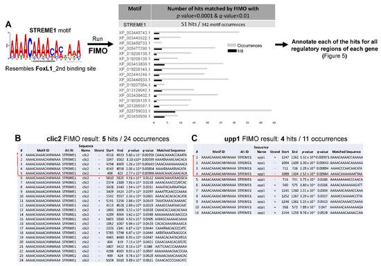 STREME1 motif scanning for occurrences in the regulatory sequences of 19 hyperosmotically induced tilapia genes. (A) FIMO was performed using the STREME1 motif to find all occurrences in the regulatory sequences. The sequence information for all identified STREME1 motifs in the regulatory sequences resulting from FIMO, such as whether STREME1 is found in sense or antisense strand; start and end position; p-value, and q-value are provided in supplementary Table S2. Fifty-one significant hits out of 342 total STREME1 occurrences were identified throughout all 19 regulatory sequences and were screened by two statistical cut off values using FIMO default p-value (0.0001) and q-value (0.01) thresholds. The number of occurrences of significant hits (black bars) and total STREME1 occurrences (grey bars) is illustrated for each of gene except for clic2 and upp1, which were chosen for further experimental validation. Some occurrences of these 51 hits represent overlapping sequences, which were consolidated into a single motif in Figure 5. Detailed information about STREME1 motifs identified in clic2 (B) and upp1 (C) regulatory sequences is shown in panels B and C with significance thresholds indicated by a red line.