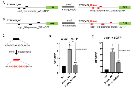 Experimental validation of STREME1 using GFP/RFP reporter assay and motif mutagenesis. Motif mutagenesis was used to replace the original STREME1 (black arrows) with a nonfunctional sequence (red arrows) by changing the core nucleotides with nucleotides not contained in that core region for chloride intracellular channel 2 (clic2, A) and uridine phosphorylase (upp1, B). (C) STREME1 motif mutagenesis strategy indicates the sequence difference between wild type (WT, black arrow) and mutant (red arrow) motifs. The transcriptional activities of the proximal regulatory regions from clic2 (D) and upp1 (E) during hyperosmolality (compared to isosmotic control medium) were measured by GFP signal (normalized with RFP control) using expression vector systems. t-test was used to calculate statistical significance yielding p-values. Iso: Isosmotic control, Hyper_WT: wild type regulatory sequence treated with hyperosmotic treatment, Hyper_Mutant: mutant regulatory sequence treated with hyperosmotic treatment, n = 5 (*: p < 0.05, **: p < 0.01, ****: p < 0.0001).