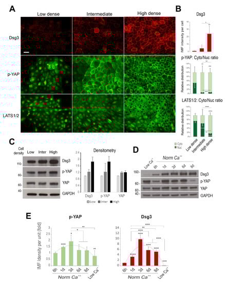 Coordinated regulation of Dsg3 and Hippo-YAP components in a cell density and a time-dependent manner. (A) Fluorescent images of N/TERT cells seeded at low, intermediate and high cell densities for 1 day before immunostaining for Dsg3 and p-YAP as well as Hippo kinase LATS1/2 showed a density-dependent increase in Dsg3 coupled with p-YAP/LATS1/2 nuclear exclusion, especially at the high cell density. (B) Quantification for the images shown in A. (C,D) Western blotting analysis of lysates extracted from cells grown at three different densities or in a time-course study that detected a cell density and time-dependent augmentation in both Dsg3 and p-YAP expression, with YAP levels appearing relatively stable, with the densitometry shown in C. For the time-course experiment, N/TERT cells were seeded in KSFM at low calcium (0.09 mM) before being replaced with KGM containing normal calcium concentration (1.8 mM). Cells were grown for various time frames before extraction or immunostaining for p-YAP and Dsg3 with the image quantitation shown in (E) and the representative images in Figure S1. A bell-shaped expression profile was detected for both p-YAP and Dsg3 (n = 5 images/coverslips, at least three experiments were performed, Mean ± SEM, p values were determined by one-way ANOVA, * p < 0.05, ** p < 0.01, *** p < 0.001 and **** p < 0.0001). Nuc: nucleus; Cyto: cytoplasm; Ca++: calcium ion. Scale bar, 20 µm.