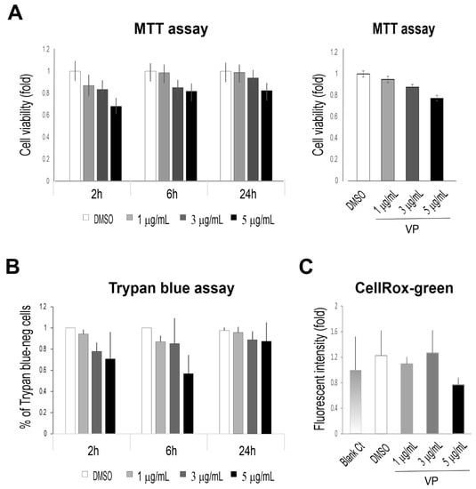 Treatment of N/TERT keratinocytes with VP shows little or no effect on cell viability. (A,B) N/TERT cells were treated with VP at various time frames and dosages as indicated in the figure. Cells were seeded in a 24-well plate in triplicate overnight before being treated with VP at increasing concentrations, i.e., 1, 3, and 5 µg/mL for 2, 6 and 24 h before MTT assay (A) and Trypan blue assay (B). (C) Measurement of the ROS levels in cells treated with VP. Cells was seeded in a 96-well plate overnight before being treated with VP at various concentrations for 6 h. Then, cells were incubated with CellRox reagent (5 µm) for 30 min before brief washing with PBS followed by image acquisition with an INCA 2200 Analyzer system straightaway. Image quantitation indicated no significant increase in ROS in cells treated with VP compared to controls (n = 25 automated fields/well, Mean ± SEM).