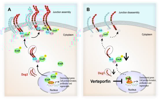 In conclusion, this study provided the first evidence that the desmosomal genes are likely the YAP-TEAD transcriptional targets and demonstrated that Dsg3 regulates YAP expression via forming a complex with and recruits p-YAP from the nucleus towards the cell surface necessary for cell junction assembly and epithelial regeneration. Inhibition of YAP-TEAD interaction by VP treatment severely impaired this process, leading to defects in desmosome assembly and attenuation of keratinocyte cell–cell adhesion.