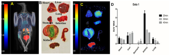 Figure 2A–D) after injection, the drug entered the heart through the bloodstream and was exported, and the standard uptake value max (SUVmax) of the heart decreased from 3.08 to 0.84. At 20 min, kidney and lung uptake of