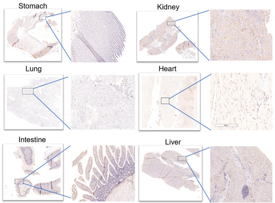 Immunohistochemical experiment: After organ imaging, ACE2 expression was studied by immunohistochemistry with a standard Envision technique in formalin-fixed, paraffin-embedded (FFPE) 4 µm specimens from pigeons. Tissue sections were dewaxed in xylene and rehydrated in gradient alcohol. Endogenous peroxidase was blocked with 3% dioxygen. Antigen retrieval was performed using a microwave by placing the tissue sections in citrate buffer (pH 6.0) and then cooling to room temperature. After closure in goat serum, the sections were incubated overnight in primary antibody against ACE2 (Abcam 108252) prepared at a dilution of 1:100 in a humidified chamber at −4 °C. The next day, after 30 min of rewarming at room temperature, the sections were stained using a Super sensitive™ polymer HRP IHC detection system (ZSGB-BIO PV-6000) according to the manufacturer’s instructions. A positive control was used with human normal kidney tissue, and a negative control was used with antibody diluent as the primary antibody. All specimens were examined by light microscopy. The IHC score of the FFPE samples was blindly quantified by two pathologists. We used a semiquantitative scoring system to assess the expression of this marker. The scoring was based on the intensity of immunoreactivity (negative—0; + −1; ++ −2; +++ −3) and tissue scanned by Aperio Versa 200, Leica.