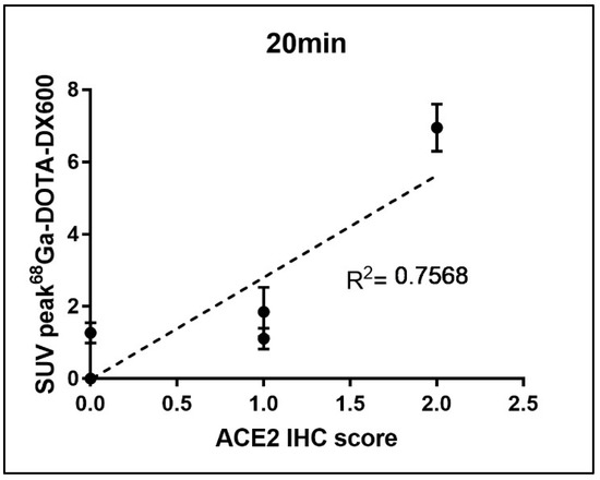 Figure 4) showed that almost no ACE2 was expressed in the heart and stomach of pigeons. However, there were two ++ in the kidneys and the small intestine, which may provide a supporting basis for acute kidney injury and fecal–oral transmission of novel coronavirus. Moreover, (+) expression of ACE2 was also observed in the liver and lung. The above results were consistent with those of PET/CT. After a simple statistical analysis of the relationship between SUV peak 68Ga-HZ20 values and ACE2 immunohistochemical scores in different organs at the same time point, a certain positive correlation was found, for there was an obvious trend at 20 min (