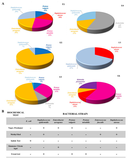Analysis of the heterogeneous composition of microbial communities extracted from patients’ ureteral catheters. (A) Pie charts showing the bacterial composition of heterogeneous microbial communities extracted from ureteral catheters for each patient. (B) Identification of isolated bacterial strains according to biochemical tests.