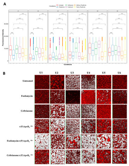 To exploit any potential synergistic effects between the r(P)ApoBLAla peptide and conventional antibiotics, we analyzed biofilm growth upon treatment with r(P)ApoBLAla peptide alone, antibiotics alone, and combinations. As previously described, the measurements recorded for each condition are representative of the whole channel (Table S3). We compared the effects of r(P)ApoBLAla plus ceftriaxone, or r(P)ApoBLAla plus fosfomycin in 1:20 ratio combinations with those of the single agents at the same concentrations. In each extract, we observed biofilm changes from dispersed to aggregated patches in the presence of r(P)ApoBLAla peptide alone or in combination (Figure 2A,B). Ceftriaxone plus r(P)ApoBLAla combinations and fosfomycin plus r(P)ApoBLAla combinations reduced biofilm coverage in U1, U2, U4, U5, and U6 extracts in a statistically significant manner, compared with peptide or antibiotic alone (p < 0.01, Figure 2A).