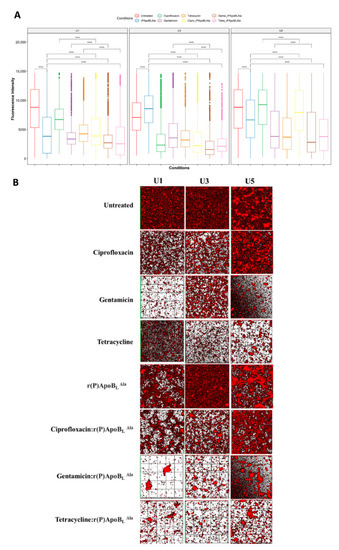 We further investigated synergistic effects to further investigate the r(P)ApoBLAla antimicrobial effectiveness. We assessed the antibiofilm effects of several antibiotics such as ciprofloxacin, gentamicin, and tetracycline alone or in combination with r(P)ApoBLAla in U1, U3, and U5 extracts. As before, statistically significant reductions in the biofilm were mediated by each antimicrobial agent, alone or in combination, compared with untreated biofilm (p < 0.05, Figure S2), except for ciprofloxacin treatment of the U3 extract (p > 0.05, Figure S2).