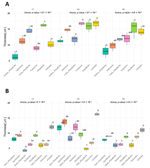 Average biofilm thickness by confocal laser scanning microscopy (CLSM). (A) Thickness of individual-patient-derived catheter extracts U1, U4, and U5 upon incubation with antimicrobial agents r(P)ApoBLAla fosfomycin or ceftriaxone alone or in combination with peptide. (B) Thickness of individual-patient-derived catheter extracts U1, U3, and U5 upon incubation with antimicrobial agents r(P)ApoBLAla or ciprofloxacin, gentamicin, or tetracycline alone or in combination with peptide. One-way ANOVA of the thickness was determined independently. Letter-based plot (a–f letters) for statistical Tukey’s multiple comparison post hoc test significance. Boxes with no letters in common are significantly different (p adjusted < 0.05).