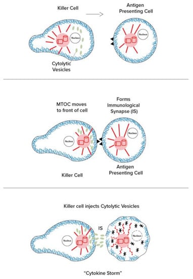 The centrosome, or MTOC, organizes and directs intra-cellular movement and activities. For example, in mitosis/cell division, centrosomes replicate and separate to pull apart duplicate sets of chromosomes by means of microtubule mitotic spindles to establish daughter cell genome and architecture. In motile cells such as fibroblasts, which move into wounds to enable healing, the centrosome/MTOC is located in the front end of the cell, directing the “leading edge” of the actin to move in the proper direction. In the immune cells that move about to find infectious agents and antigen-containing cells, the centrosome/MTOC is behind the nucleus, still playing a key role in directional guidance and motility. However, when an immune cell, such as a killer T cell, reaches an antigen-containing cell, it forms an “immunological synapse” (IS), and the centrosome/MTOC moves to the front, near the IS. From there, the centrosome/MTOC directs release of cytolytic substances, including cytokines, tumor necrosing factor, and interleukins, in a phenomenon referred to as “cytokine storm” (Figure 3).