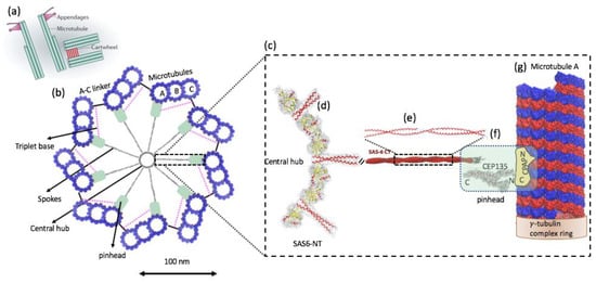 In human cells, the centriole is a cylindrical structure, typically 450 nm in length and with inner and outer diameters of ~130 nm and ~250 nm, respectively. Centrioles and procentrioles are characterized by a nine-fold radial symmetric arrangement of triplet microtubules that is polarized along its height, with the base referred to as the proximal end and the tip as the distal end. The proximal region of the centriole is defined by the presence of the cartwheel structure, which serves as an essential seed for centriole formation and is thought to participate in establishing the nine-fold symmetry of the entire organelle (Figure 5a) [24,25]. The cartwheel is built from a central hub (20~25 nm in diameter) from which nine spokes (40~45 long) emanate and connect through a pinhead (~20 nm) with A-microtubule of the peripheral microtubule triplets (Figure 5b). Each hub ring can accommodate nine homodimers of SAS-6, a protein that is essential for cartwheel assembly. The A-microtubule from one triplet is connected with the C-microtubule of the next triplet in a clockwise manner via a so-called A–C linker. The pinhead and the A–C linker, which are connected through the triplet base, extend more distal than the cartwheel and co-exist with the inner scaffold structure (the cartwheel is indirectly connected to the A–C linker through a flexible triplet-base structure extending from the pinhead). A close-up view of the A-microtubule and its associated key proteins on human centrioles and procentrioles, such as hSAS-6, CEP135, and CPAP, is shown in Figure 5c–g [26,27,28]. In this regard, a recent study applied cryo-electron tomography to four procentriole cartwheels of human cells (note that mature human centrioles lack cartwheels) in order to determine the cartwheel length and to better understand the relationship between the A–C linker and the cartwheel. This study found that the cartwheel length extends 189 +/− 9 nm and spans 70% of the length of the A–C linker (270 +/− 26 nm of the proximal region) in humans, where their study considered a procentriole length of ~410 nm [29].