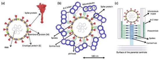 (a) Schematic of structural proteins of the SARS-CoV-2 virion. (b) Top view cartwheel complexed with the invading SARS-CoV-2 virion. Trimeric spike (S) protein on the surface of the SARS-CoV-2 is shown in red. (c) Side view of cartwheel-containing procentriole in complex with SARS-CoV 2 virion. (Part of (c) is adopted from [25] with author permission).