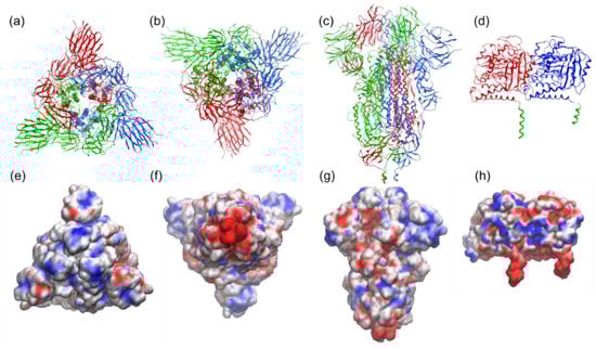 Structure and electrostatic map of the SARS-CoV-2 spike-S1 protein as viewed from (a,e) top (crown), (b,f) bottom (junction of S1 and HR2 linker; HR2 linker is not shown here), and, in (c,g), side, based on Protein Data Bank (PDB) entry 6VXX. The trimeric assembly of the spike protein (each monomer is colored in red, blue, and green) is presented as cartoon (first row) and as the electrostatic potential map (second row) highlighting a trefoil of positive charge (blue) around the central point. (d,h) Structure and electrostatic map of tubulin protein (PDB: 1jff) (α and β tubulin are in blue and red, respectively, and C-terminals are depicted in green). The VMD molecular graphics software package was used for both the execution of APBS (Adaptive Poisson–Boltzmann Solver) [35] and the visualization of the resulting electrostatic potentials. AMBER force field [36] parameters such as atomic charges and radii are assigned using PDB2PQR webserver (http://server.poissonboltzmann.org, accessed on 29 May 2021) [37].