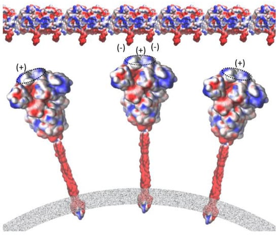 Several studies have characterized the interactions of various microtubule-associated proteins and the role of the negatively charged C-terminal tubulin tails in binding positively charged domains of these proteins to the tubulin surface [40,41]. Electrostatic potential at the binding interface provides insights into the role of electrostatic in the binding. Detailed information about the spike protein’s electrostatic surface can be obtained via the APBS calculation and the visualization of the resulting electrostatic potentials (see Figure 7 and Figure 8).