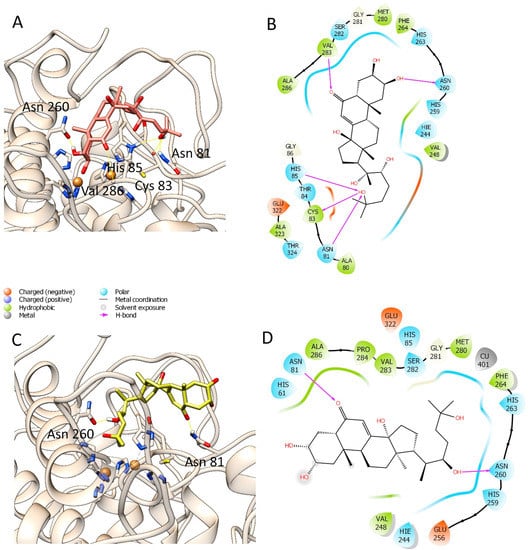 The docking experiments were conducted using Maestro 2017 software [20] with the scoring function XP employed previously to dock secondary bioactive metabolites to tyrosinase [13,21]. The grid for docking was automatically assigned via centering the box on the crystallographic inhibitor, extending around the ligand center with a box side of 25 Å. The docking scores obtained for ecdysteroids docked to tyrosinase were then determined. The enzymatic pocket of the crystallized enzyme contains a binuclear copper-binding site in the deoxy-state, in which three histidines coordinate each copper ion. The side chains of these histidines have their orientation fixed by hydrogen bonds or, in the case of His85, by a thioether bridge with the side chain of Cys83. The specific tyrosinase inhibitor tropolone forms a pre-Michaelis complex with the enzyme. It binds near the binuclear copper site without directly coordinating the copper ions [17].