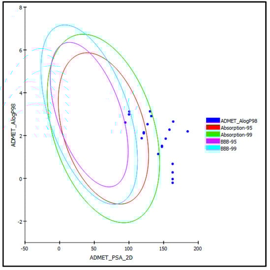 ADMET plot for selected ecdysteroids showing 95% and 99% confidence limit ellipses corresponding to the blood–brain barrier (BBB) and the human intestinal absorption models in ADMET_AlogP98.