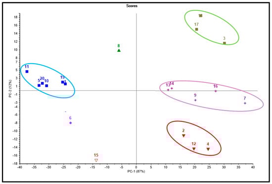PCA score plot of different ecdysteroids employing multivariate analysis; compounds are given numbers illustrated in Figure 1.