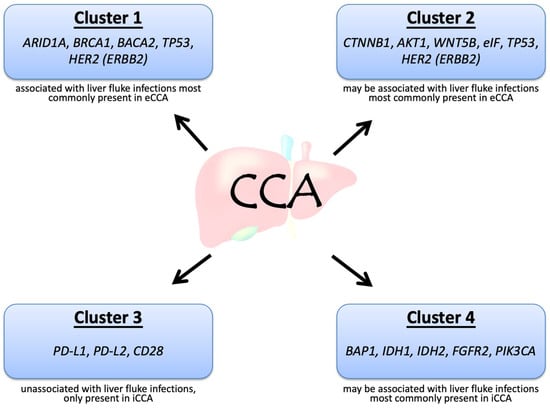 CCA can be divided into four clusters based on the genetic alterations and clinical features, in particular, whether it is associated with flukes and whether it is internal or external (Figure 1) [7]. Mutations in IDH1, IDH2, BAP1, and rearrangements in FGFR2 are often present in iCCA, whereas HER2 and TP53 mutations are frequent in eCCA. Among the above genetic alterations, FGFR2 fusions may be associated with the best prognosis [7]. Although both iCCA and eCCA originate from the bile ducts, the distinct etiology may contribute to the different genetic alterations in CCA. The acronyms and full names of the genes are listed in Table 1.