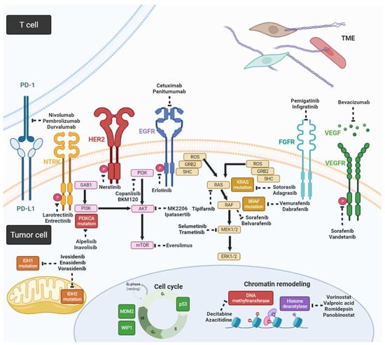 Schema for potential targeted agents and related signaling pathways in CCA (created with https://biorender.com/ (accessed on 25 May 2022)).
