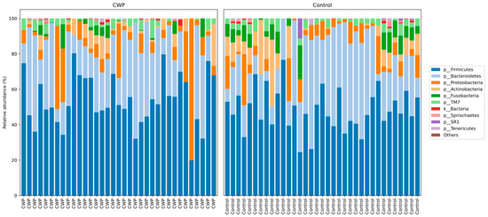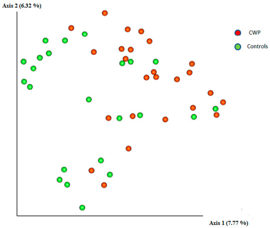 In the current study using 16S rRNA sequencing (V3–V4) in CWP patients and control subjects using sputum samples, a total of eight phyla with relative frequencies above 0.1% were identified. The prevailing phyla in our dataset were Firmicutes, Bacteroidetes, Actinobacteria, and Proteobacteria (Figure 1), as expected from previous studies [29,30]. For these eight types of bacteria, there were no differences between patients and controls (Table 2). ASVs in CWP subjects amounted to 142.0 ± 56.04, while in the control group–147.43 ± 43.6 (p > 0.05). Regarding alpha diversity, neither the number of allocated ASVs nor the Shannon indices showed any significant differences between CWP and controls. Overall, bacterial communities in the two groups in the study were fairly diverse as indicated by the Shannon index at the genus level (6.466 in CWP vs. 6.545 in controls).
