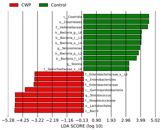 In addition, we applied methods of discriminant analysis to find the most significant characteristics that distinguish groups of data from each other. The LEfSe method revealed an increase in the abundance of a number of taxa both in the CWP group (red) and in the control group (green) (Figure 3). The ANCOMBC method revealed an increase in the absolute abundance, in the CWP group relative to the control, for Streptococcus (beta = 1.86, W = 3.94, SE = 0.47, q-value = 0.01).
