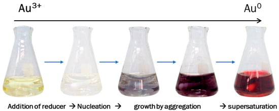 Progress of the gold nanoparticles synthesis reaction. The yellow-colored solution corresponds to the Gold (III) ions in water. When the citrate solution is added, the mixture turns clear, and further color changes occur until the mixture turns an intense red color at a supersaturation stage.
