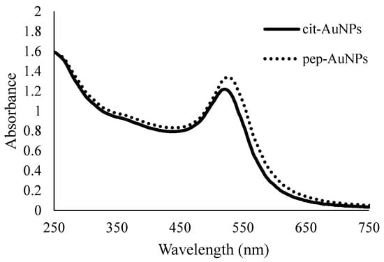 The proposed method for the surface functionalization of AuNPs with Chlorella microalgae peptide (VECYGPNRPQF) was successful, as confirmed by the characterization information obtained with different analytical techniques. AuNPs have optical properties that are characteristic of their size and morphology. UV-VIS Spectroscopy was used to determine the maximum wavelength of absorption (λmax) of the AuNPs, since this value is related to the surface resonance plasmon, which is dictated by the size, morphology, and surface chemical interactions of the metallic nanoparticles []. The absorbance spectra of the synthesized AuNPs, as shown in Figure 2, demonstrate the λmax of cit-AuNPs to be 522 nm and of the pep-AuNPs to be 526 nm. These values of λmax have been reported to correspond to spherical AuNPs ranging between 20–30 nm in diameter []. However, slight shifts in these absorbance peaks may indicate differences in size and surface modification []. Therefore, complementary information obtained with other techniques was used to confirm sizes and surface properties.