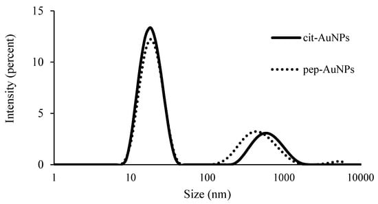 Dynamic Light Scattering (DLS) was performed to obtain information about the AuNPs’ particle size, polydispersity distribution, aggregation, and stability. Specific values of z-average, intensity percentages of peaks, polydispersity indexes, and Zeta-potential are summarized in Table 1. DLS diagram (Figure 3) shows the primary symmetric peak with high intensity at around 18 nm of diameter for the cit-AuNPs and approximately 20 nm for the pep-AuNPs. These values represent most of the particles in the solution. A smaller peak was observed for both samples at a higher value, indicating aggregation of the particles and not the presence of bigger particles. The PDI values support this at around 0.4 for both samples. PDI is used to estimate the uniformity of the particles in the solution, and the sample is considered monodispersed if the value is <0.1 []. On the other hand, if the value of PDI is >0.7, the sample is considered to have a broad distribution and, thus, is not suitable for DLS measurements []. Zeta-potential values describe the dispersion stability and provide information about the polymer’s affinity, in this case, a peptide used for the modification []. The surface modification of the nanoparticles was confirmed with the increased size of the pep-AuNPs regarding the peptide coating, and the decreased magnitude of the Zeta-potential indicates a less negative surface due to the shielding effect the neutral peptide strong interaction []. The measured values were −44.14 mV for the cit-AuNPs and −42.96 mV for the pep-AuNPs (Table 1). Generally, colloids with Zeta-potential values beyond ±30 mV are highly stable dispersions [].
