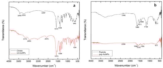 FTIR spectra of the nanoparticles and the stabilizing agents confirm the gold nanoparticles’ surface modification. (a) citrate and cit-AuNPs and (b) peptide and pep-AuNPs.