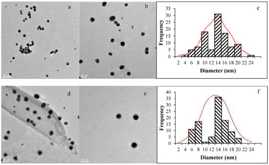 TEM images and histograms of the gold nanoparticles. (a,b) TEM images of cit-AuNPs; (c) Size distribution of the cit-AuNPs determined with ImageJ. (d,e) TEM images of pep-AuNPs; (f) Size distribution of the pep-AuNPs determined with ImageJ.