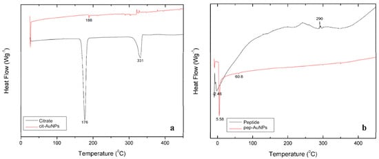 Differential Scanning Calorimetry (DSC) was used to determine if the different ligands (citrate and peptide) attachment to AuNPs increased their thermal stability. The DSC thermogram for trisodium citrate dihydrate showed a peak at 176 °C and another at 331 °C, which corresponds to the two-step dehydration of the salt, as reported in the literature [] (Figure 6a). However, in the cit-AuNPs, these peaks were shifted to 188 °C and 334 °C. This shift could be associated with the interaction that the inner citrate carboxylate groups generate with the AuNPs surface, which causes the dehydration process to involve more energy. Moreover, two peaks were detected in the cit-AuNPs thermogram at the 330–335 °C range, which may be attributed to the recrystallization of the citrate []. Thermograms for the peptide and the pep-AuNPs are presented in Figure 6b. The peptide thermogram shows the presence of two prominent peaks: one at 2.46 °C related to the glass transition of the peptide and the other at 290 °C related to its recrystallization. The thermogram for the pep-AuNPs presented two peaks at 5.58 °C and 60.8 °C. The 5.58 °C peak may be attributed to the glass transition temperature, and the subsequent peak could be attributed to the change in the peptide’s secondary structure. The liquid to glass transition is an inherent feature of the peptide dynamics associated with the breaking/loosening of hydrogen bonds at specific points called defects []. The glass transition for the pep-AuNPs was detected at a higher temperature. As demonstrated in the FTIR spectra (Figure 4b), some of the hydrogen interactions of the peptide were replaced with the interactions established with the AuNPs surface, conferring higher stability to it. Moreover, because a small sample could be recuperated after lyophilization, the representative peaks of the thermal shifts were not very intense. They exhibited an uneven distribution of heat flow. However, the other complementary techniques evidence the colloidal stability and the surface of the AuNPs’ interaction with the ligands.