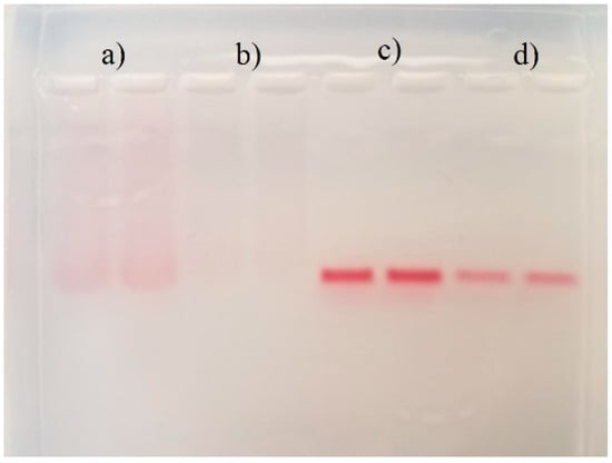 Agarose electrophoresis (1% gel) in TBE 1x running buffer. (a) cit-AuNPs, (b) washed cit-AuNPs, (c) pep-AuNPs, and (d) washed pep-AuNPs.